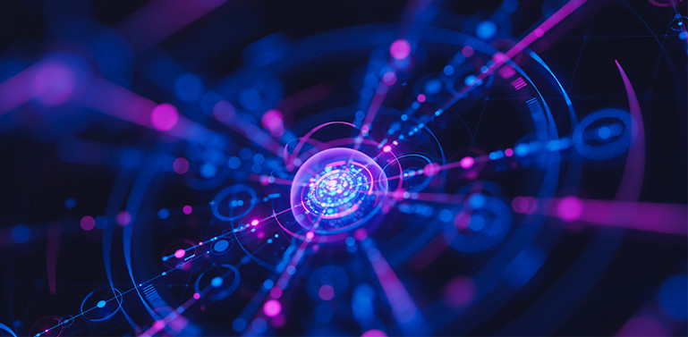 Abstract light trails in vibrant colors swirl against a dark background, creating a dynamic and energetic visual effect.
